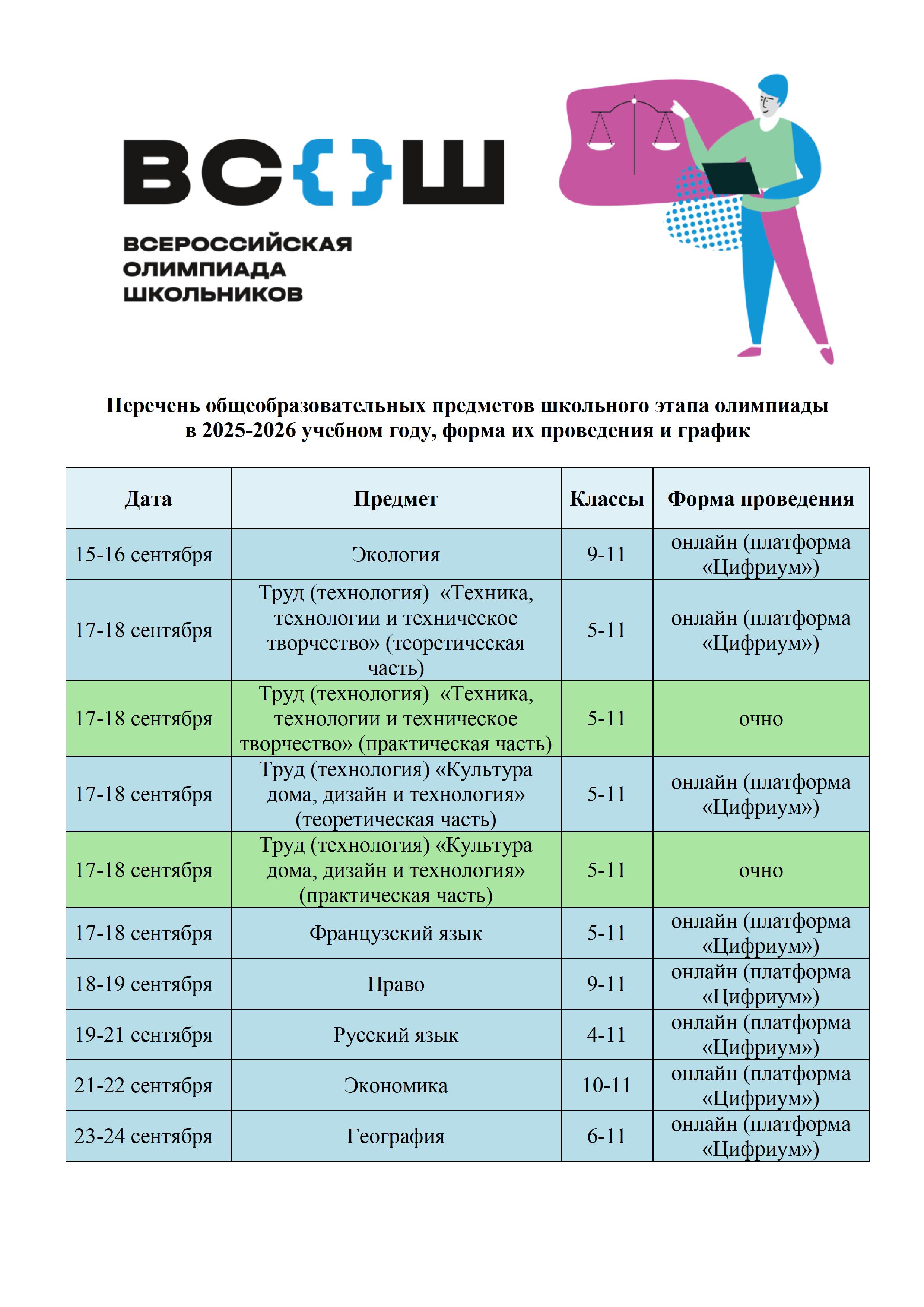 Перечень общеобразовательных предметов первого этапа всероссийской олимпиады школьников в 2025-2026 учебном году